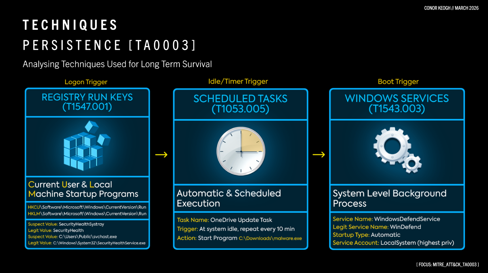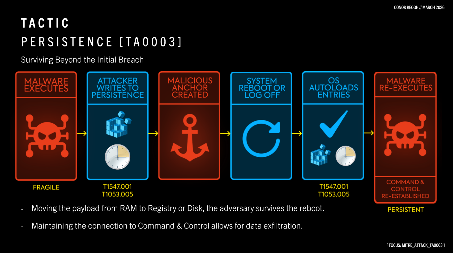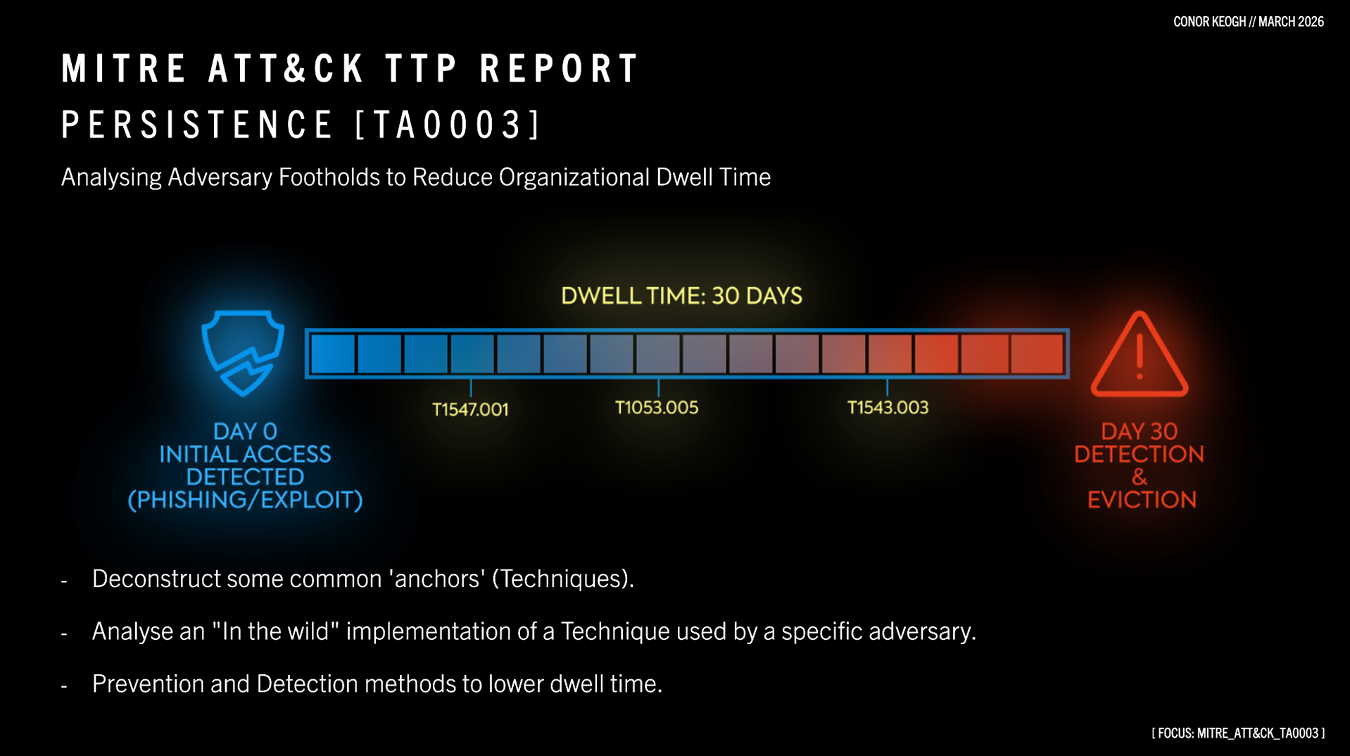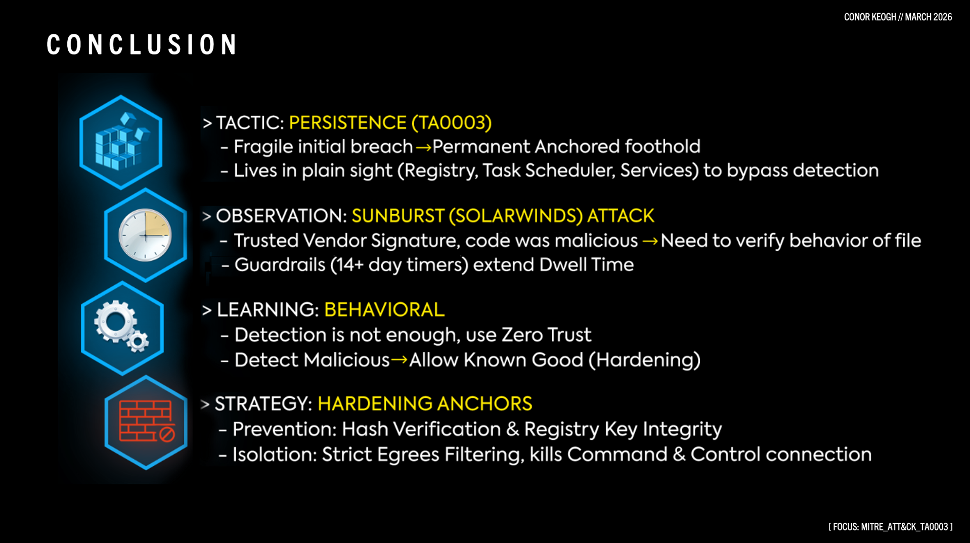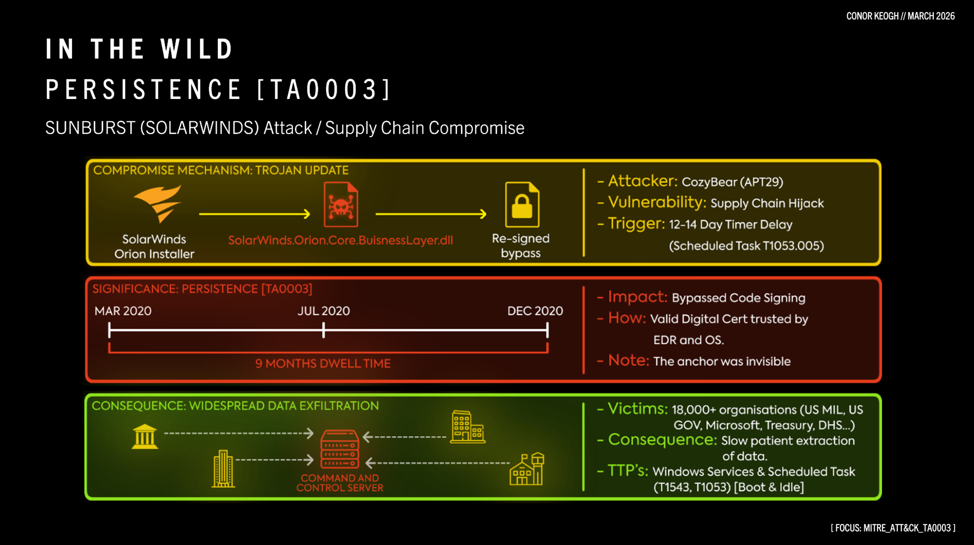 Developed as a capstone briefing for a high-intensity Cybersecurity Bootcamp, this project was presented at State Street Kilkenny to demonstrate technical mastery of the MITRE ATT&CK framework. The presentation synthesizes the mechanics of Windows-based persistence with a strategic analysis of the SUNBURST (SolarWinds) supply chain breach