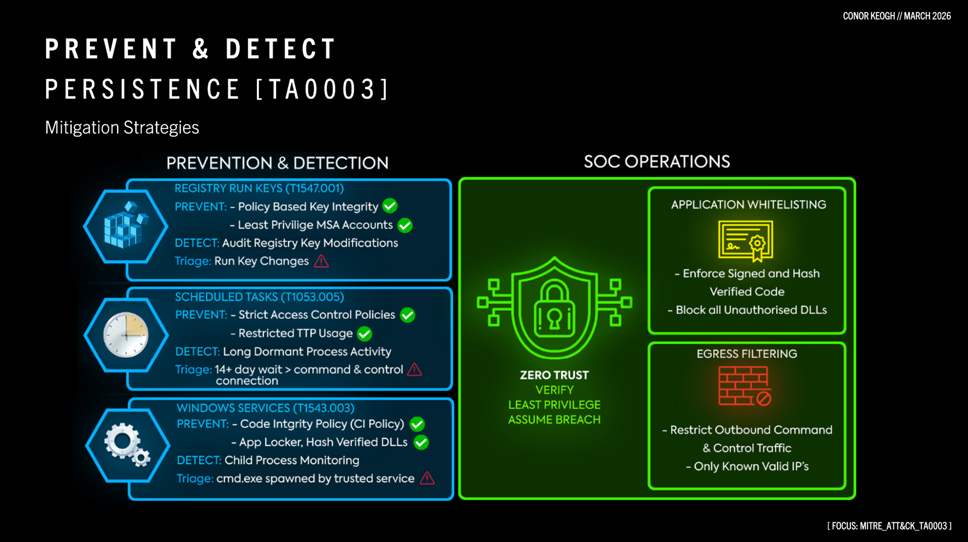 An analysis of MITRE ATT&CK Tactic TA0003. This project explores how attackers weaponize administrative trust to bypass detection, focusing on the failure of traditional code-signing in the SUNBURST breach and the implementation of AppLocker and Egress filtering as critical mitigations.