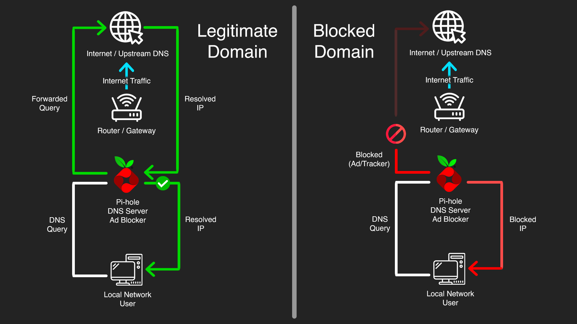 • Centralized DNS Control: All DNS queries from network devices are routed through Pi-hole, providing a single point of management and visibility for all domain lookups. This prevents individual devices from bypassing DNS filtering.